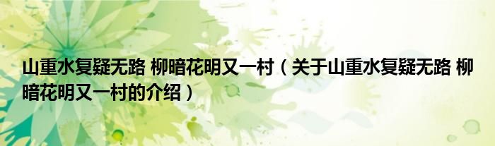 大家好,小都来为大家解答以上的问题。山重水复疑无路 柳暗花明又一村,关于山重水复疑无路 柳暗花明又一村的介绍很多人还不知道,现在让我们一起来看看吧!