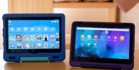 Fire 平板电脑的儿童版本质上与标准型号的硬件相同,有 7 英寸、8 英寸或 10 英寸三种尺寸。它们包括一个带有内置支架的儿童保护套、两年的损坏保护以及一年的亚马逊 Kids Plus 服务订阅,该服务提供了一个适合儿童的界面,并可以访问适合年龄的游戏、应用程序、视频、和平板电脑上的书籍。每种尺寸都有适合 3 至 7 岁或 6 至 12 岁的特定版本。
