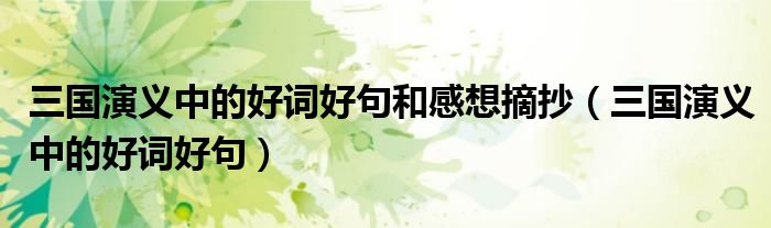1、好词摘抄: 一手包办、一举两得、一臂之力、一亲芳泽、七步成诗、三顾茅庐、下笔成章、不出所料 不由分说、不知所云、不容偏废、乘虚而入、五内如焚、人生如寄、仰人鼻息、伯仲之间 位极人臣、作奸犯科、偃旗息鼓、出言不逊、分久必合,合久必分、初出茅庐、刮目相待 危在旦夕、危急存亡之秋、司马昭之心,路人皆知、同符合契、吴下阿蒙、敝帚千金 廊庙之器、才高八斗、手不释卷、指日可待、探囊取物、文思泉涌、旦夕之危、明眸善睐 月明星稀、土崩鱼烂、如入无人之境、如鱼得水、妄自菲薄、孑然一生、对酒当歌、 屈指可数 好句摘抄: 不求同年同月同日生,但求同年同月同日死。